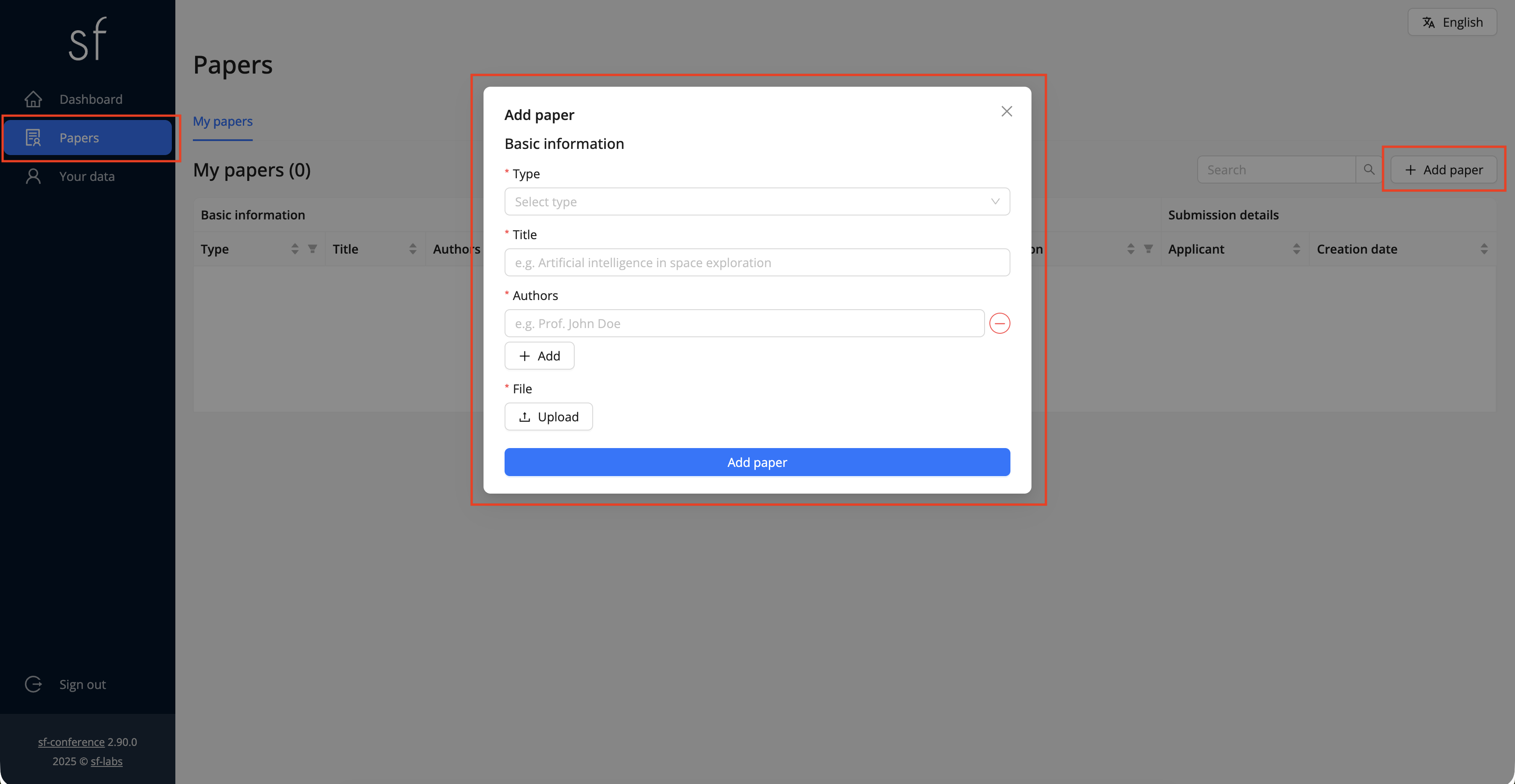 - Proceed to the section Papers and click + Add paper. Select the corresponding type: Abstract, Poster or Presentation, provide the required information and upload the file. You will receive an email confirmation and be able to see your paper in the system.